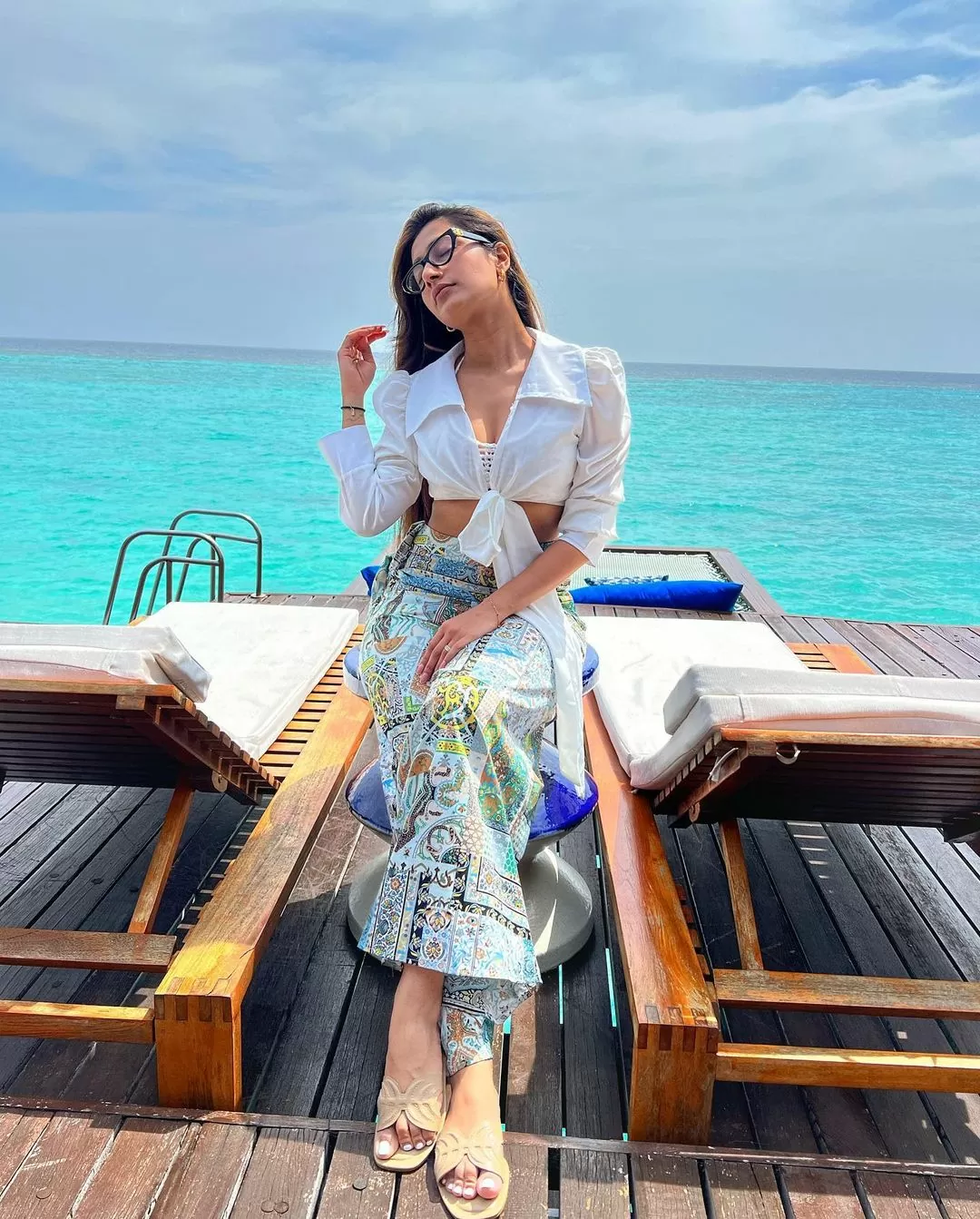 For this look, Dhanashree has chosen a printed long skirt with a shirt dress, which gave her the perfect beach look.