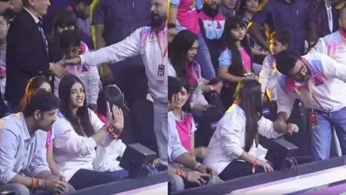 This video is of Abhishek Bachchan during the Kabaddi match being played by the Pink Panthers team. In this video, Abhishek Bachchan, Aishwarya Rai, Aaradhya Bachchan, Navya Naveli and Sikandar Kher are seen sitting in the audience gallery. First Aishwarya Rai calls Abhishek Bachchan and Abhishek Bachchan is seen explaining something to his wife.