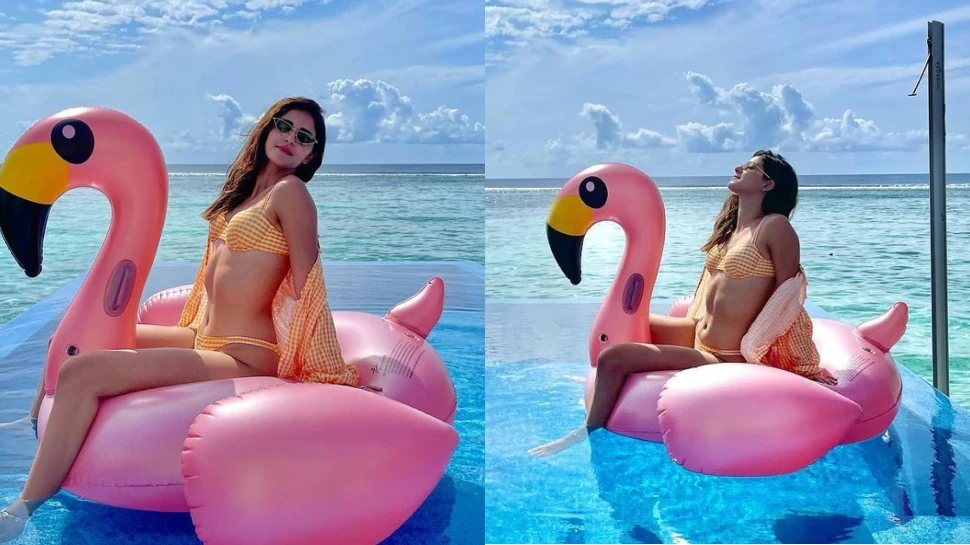 Ananya Pandey (Ananya Panday Bik*ini Photos) is seen sitting on a flamingo in the swimming pool on the seashore. The actress has crossed all limits of bo*ldness by wearing an orange colored bik*ini. Ananya Pandey’s golden body is shining on the beach.
