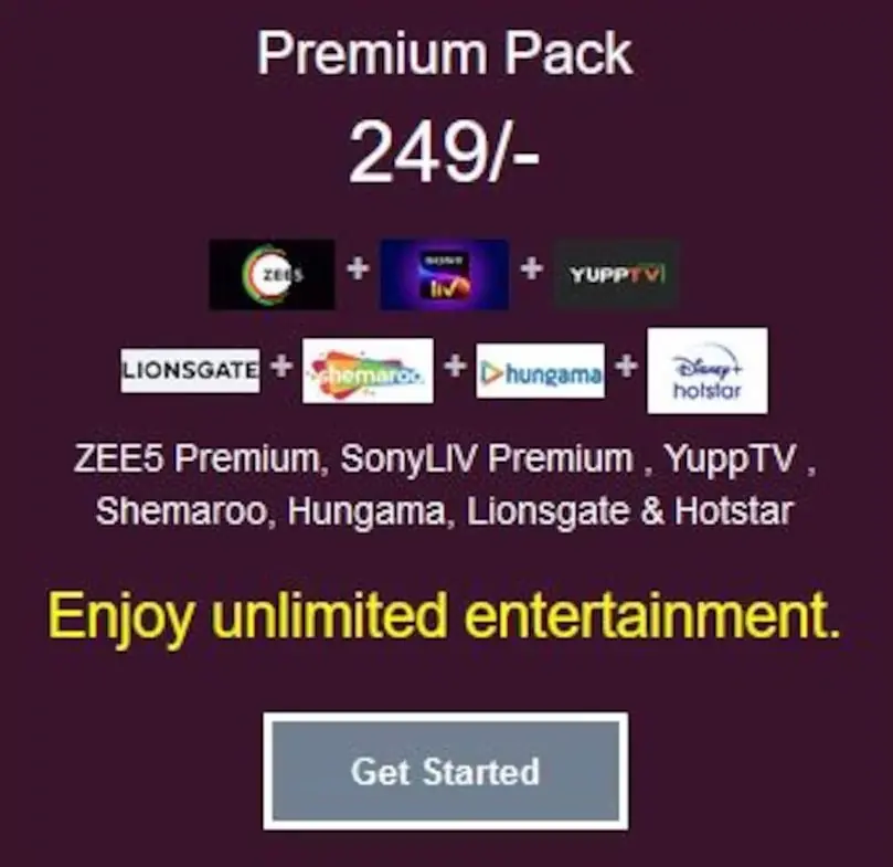 In this starter plan, users can watch content from Lions Gate, Hungama, Epic On, Shemaroo OTTs.
