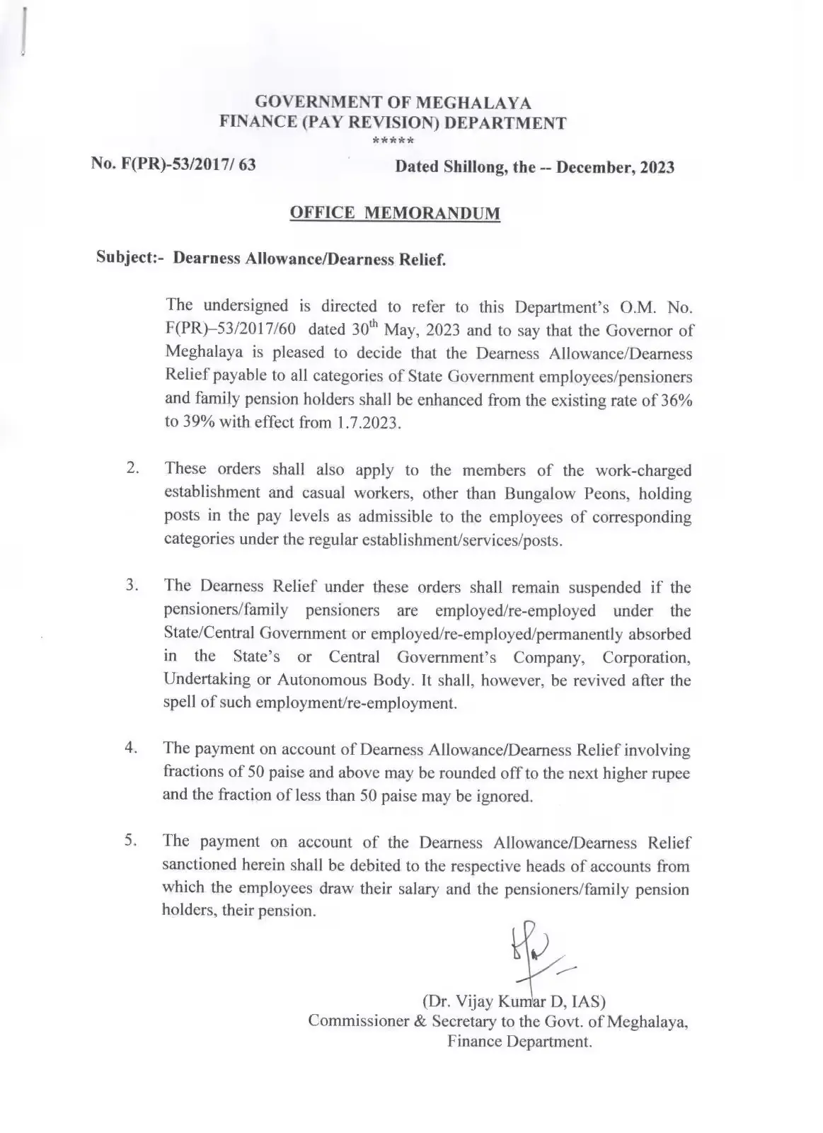 The Chief Minister also shared an office memorandum of the Finance Department, in which the Governor has decided to increase the dearness allowance for employees and pensioners from the current 36 percent to 39 percent from July 1.
