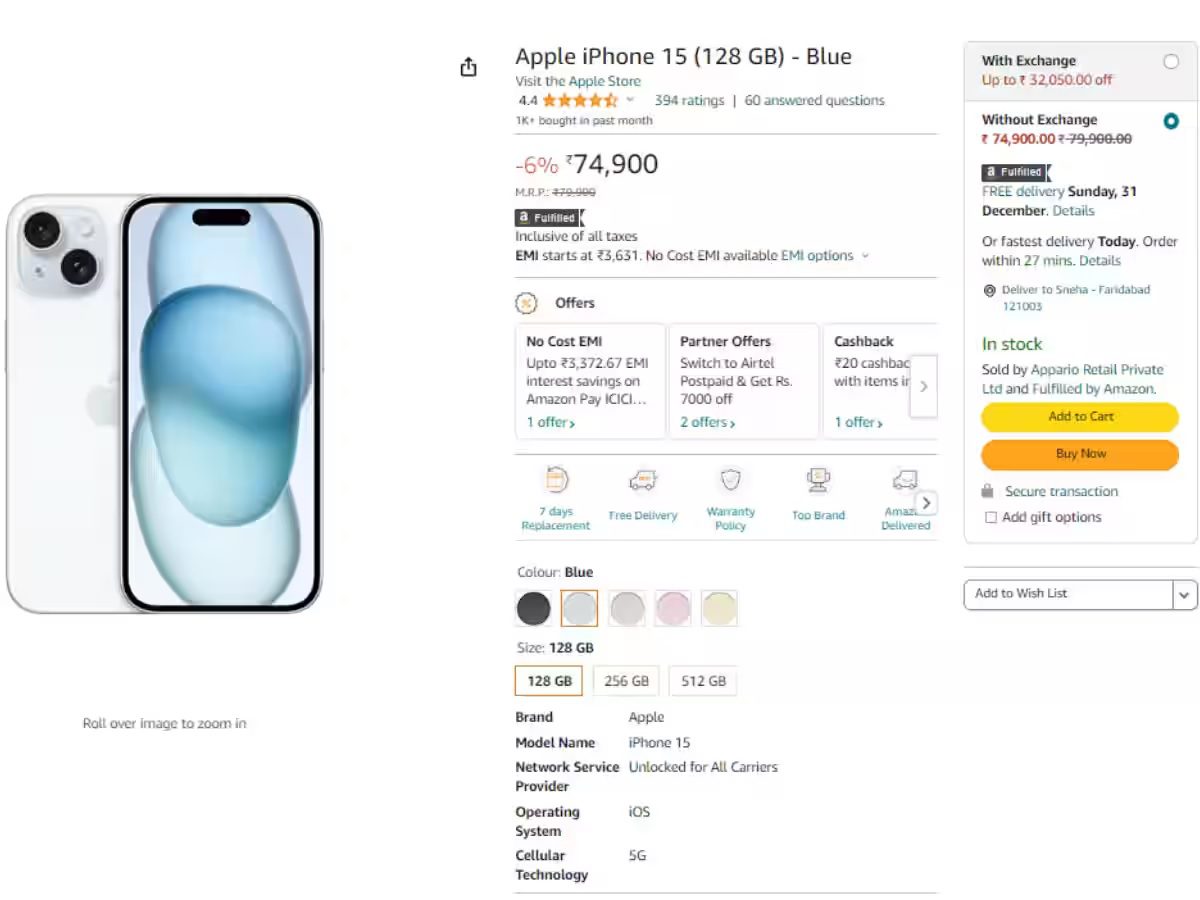 Amazon Discount Offer: You can buy the 128GB variant of iPhone 15 from e-commerce site Amazon for Rs 74,900. Amazon has given a direct discount of up to Rs 5,000 on it.