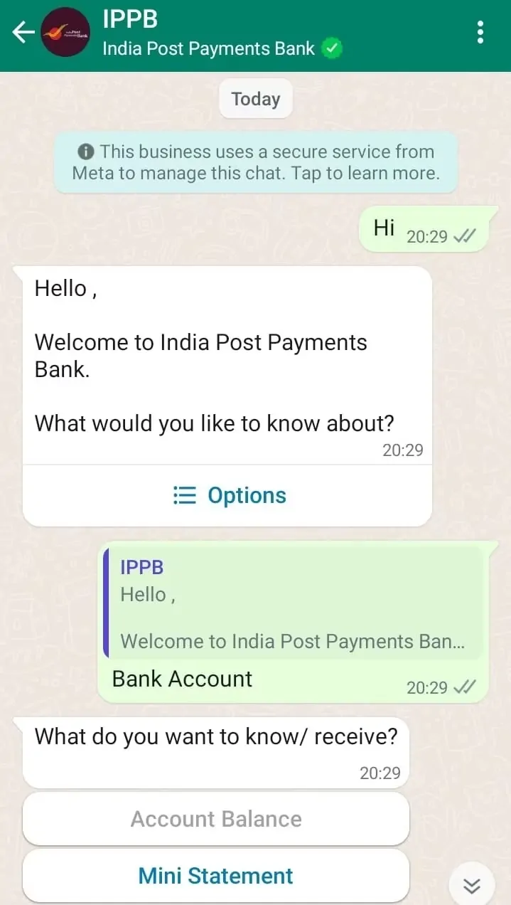 Customers of India Post Payments Bank can request for mini statement etc. apart from checking account balance through their WhatsApp banking only from the comfort of their homes.