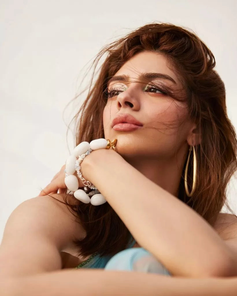 In these pictures, the actress is wrapped in a blue colored transparent cloth over a green colored bikini. In the picture, the actress was seen in big round earrings with her hair open.