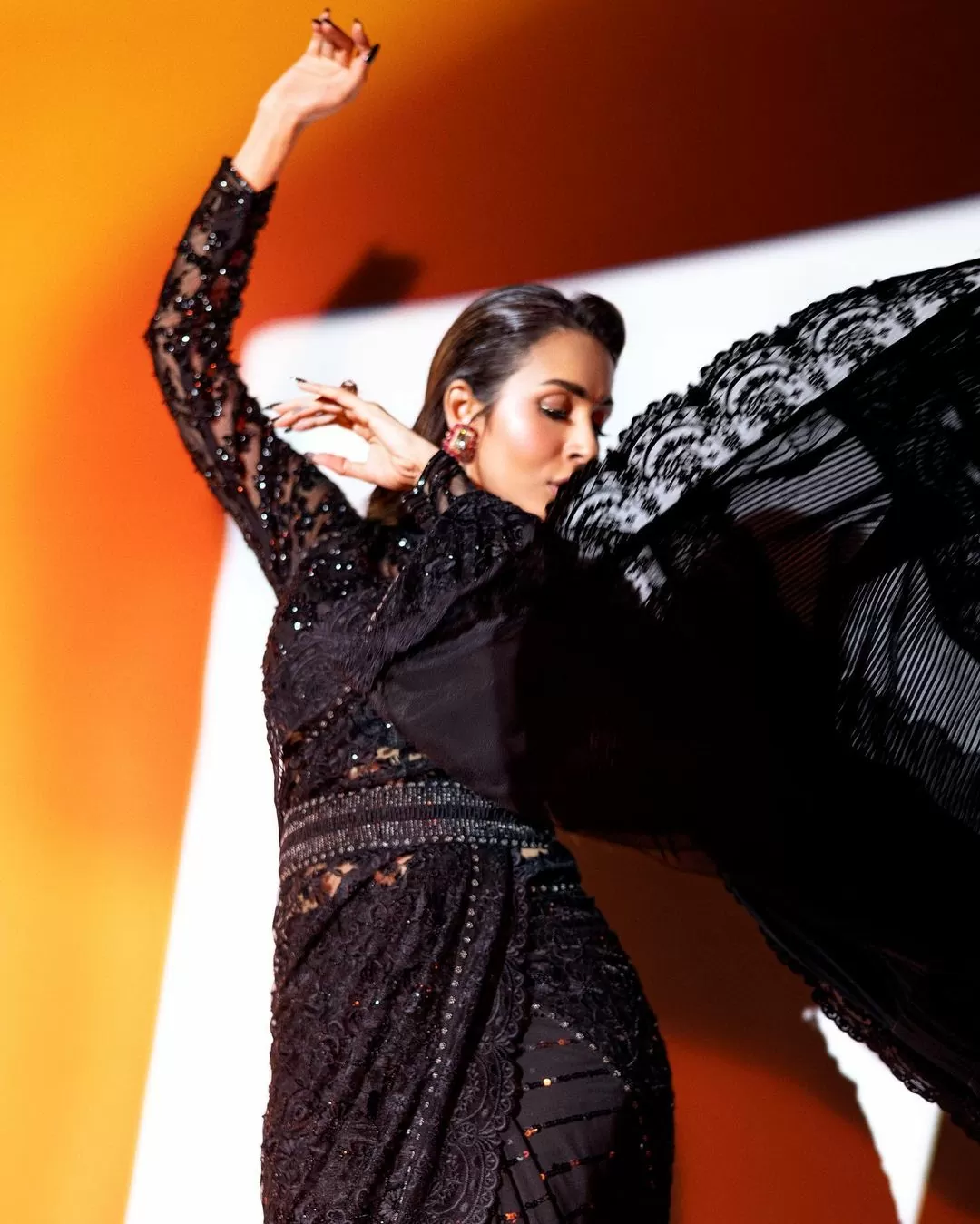 To make her saree look more classy and stylish, Malaika wore a black netted full sleeve blouse. This blouse is making this sari look of Malaika even more special.