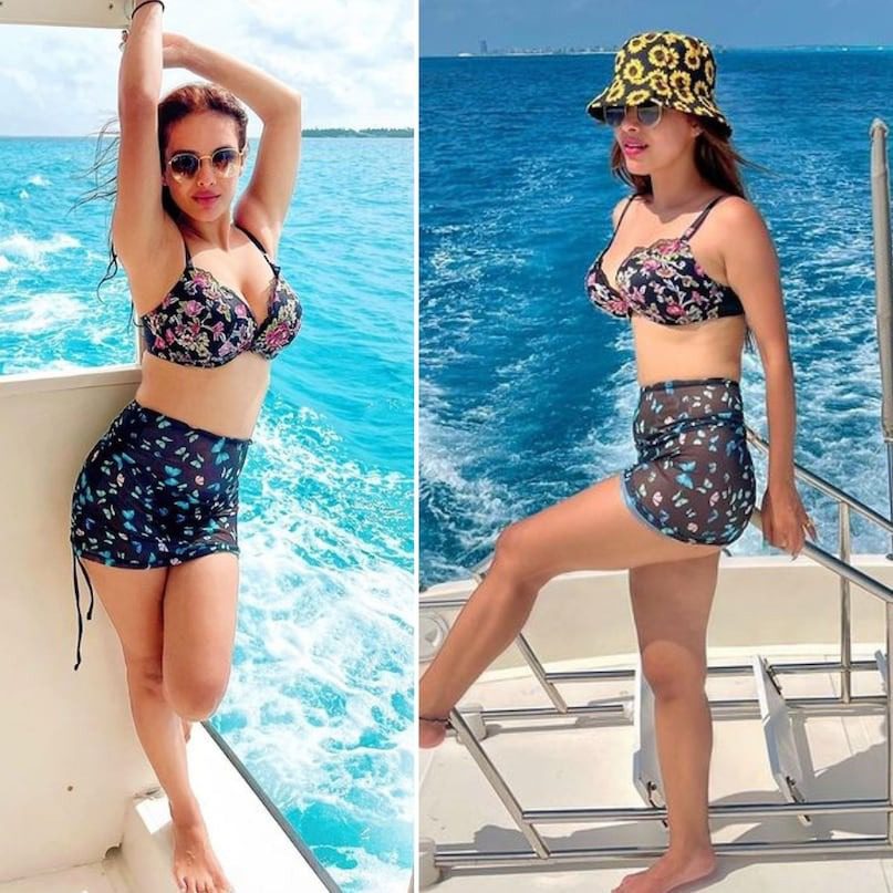 Neha Malik herself has shared the photos on her Instagram account, in which she can be seen in a black colored transparent mini skirt and along with it she is giving a great pose wearing a hat in a moving boat.