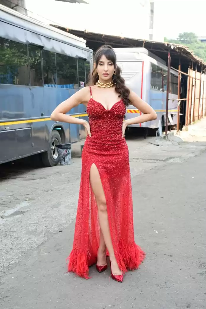 The fitting of the dress is also quite tight and Nora is looking very hot in this pose. Let us tell you that these pictures are from the set of Jhalak, where the actor is posing before shooting.