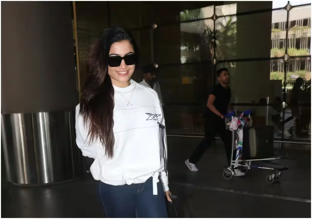Actress Rashmika Mandanna carried her all-time favorite denim jeans with a white hoodie. In which the actress was looking very chic and stylish.