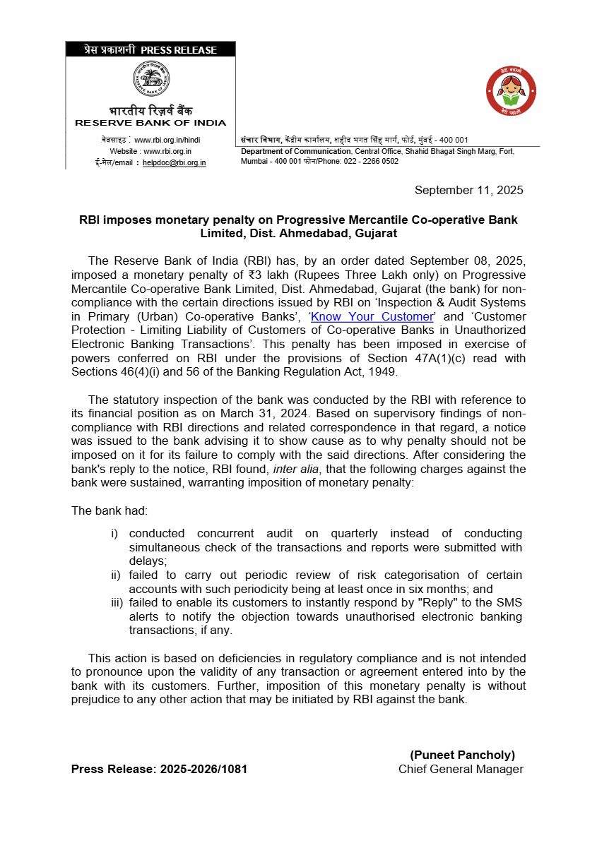 A fine of Rs 3 lakh has been imposed on Progressive Mercantile Co-operative Bank Limited Ahmedabad, Gujarat. It is accused of violating many banking rules including KYC, customer protection. A fine of Rs 50 thousand has been imposed on Sikkim State Co-operative Bank Limited.