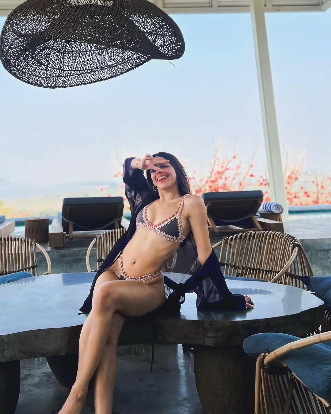 Alaya F flaunts her toned abs and stylish bikini set on a table by the pool in her new photoshoot. (Photo courtesy Instagram @alayaf)