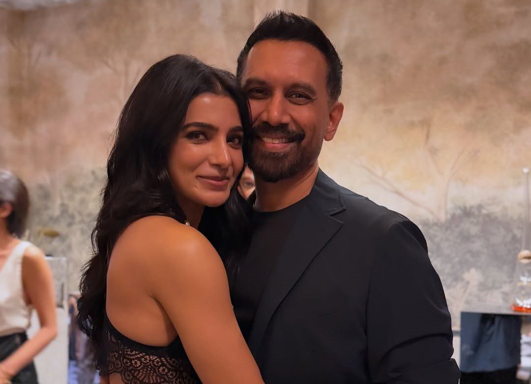 In one photo, taken at the launch of her perfume brand, Secret Alchemist, Samantha is seen posing next to Raj. Samantha held Raj in her arms, while Raj held her waist. In another photo, she was seen with other attendees at the event, with Raj standing behind her. Tamannaah Bhatia was also seen in one photo.