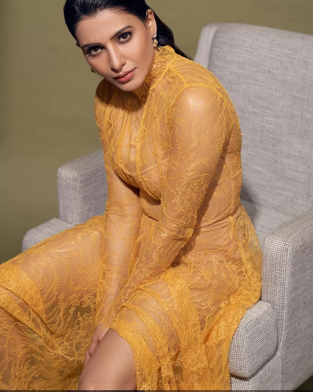 In this picture, Samantha can be seen wearing a transparent shirt in lemon color. During this, her blue bralette is clearly visible. Also, Samantha has paired a cool skirt with this shirt. To complete her look, she has done glossy make-up and hair is scattered.