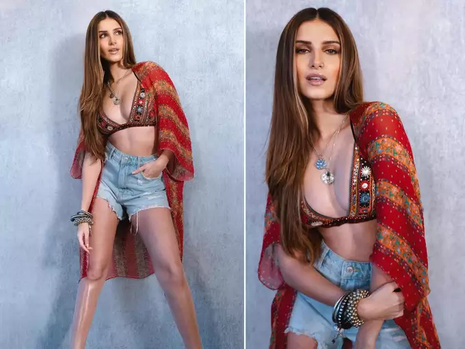 The actress paired her bralette top with blue denim shorts in a high-rise pattern. At the same time, light disturbed details were also given in it. Tara was seen flaunting her toned legs in these shorts. At the same time, to complete her look, Hasina carried a red color cape, on which an orange color print was visible. She wore such a cape, which looked very similar to the bralette top.