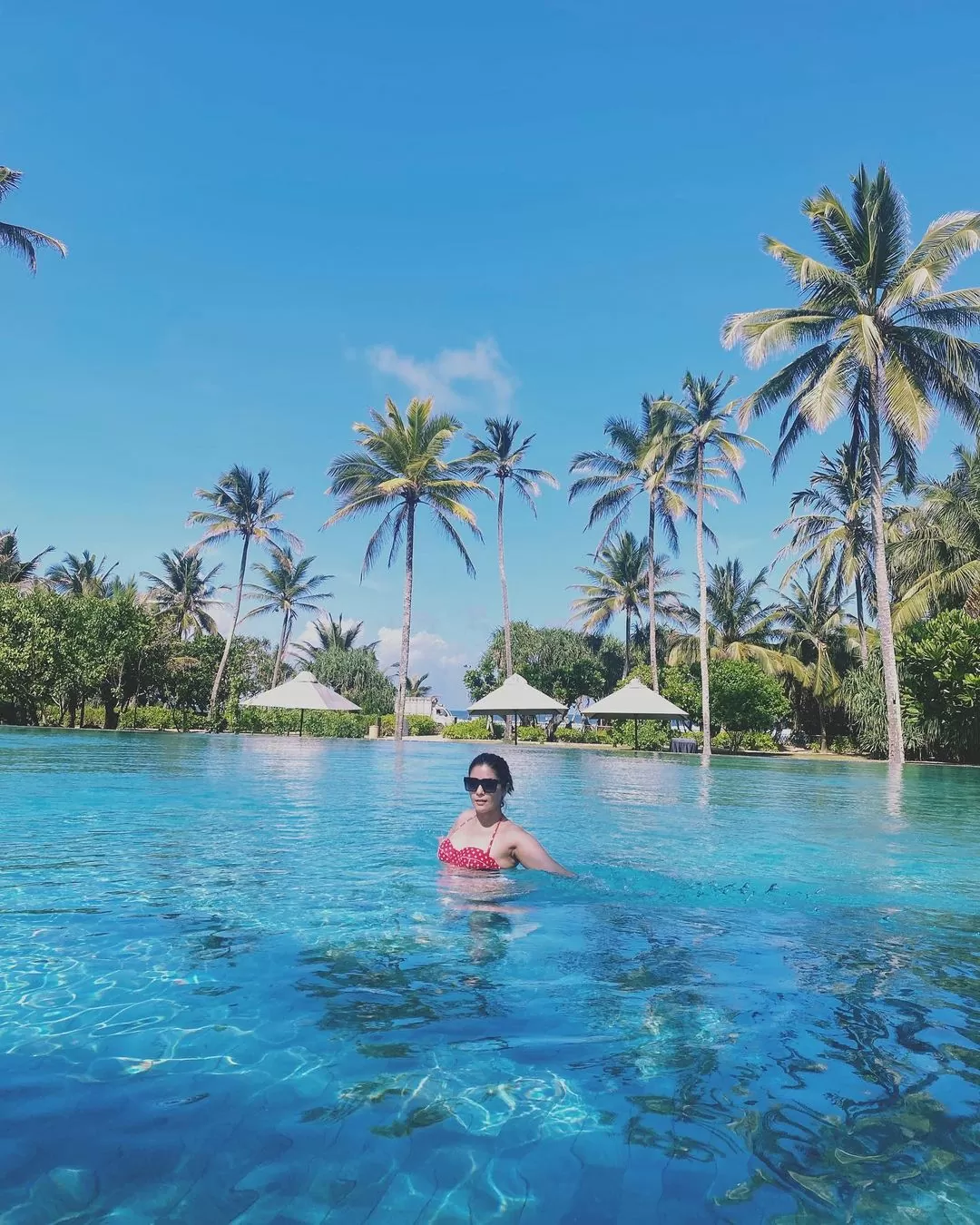 This bikini of the actress is of red color polka dot print. Wearing this, Pooja is getting more than one photo clicked by getting into the water. Fans are going crazy seeing Pooja’s look in these photos.