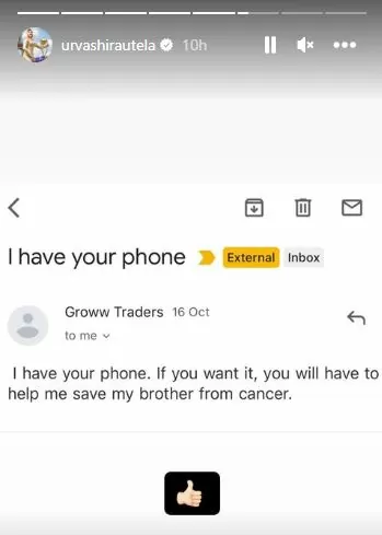 Urvashi Rautela has received a mail in the name of Groww Traders, the screenshot of which has been shared by the actress on her social media on which it is written – Your phone is with me, if you want to get it back then you will have to help me. My brother has cancer and should get him treated. The actress has made a thumps-up sign on this post, which shows that she will help them.